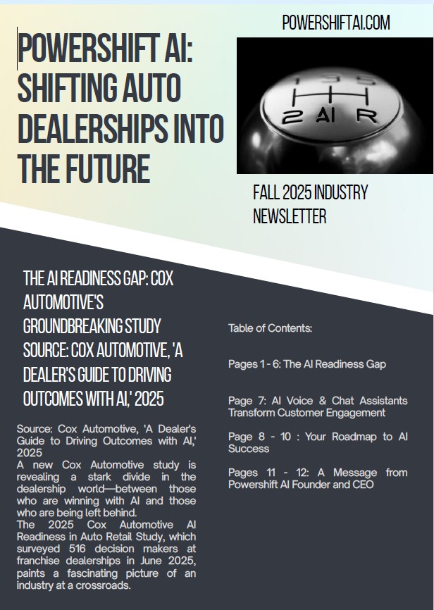 Creator of Powershift AI, Bradley Barkhurst gives the latest news on AI and tech at auto dealerships. This episode features the Cox Automotive Study released in October of 2025 among other stories.